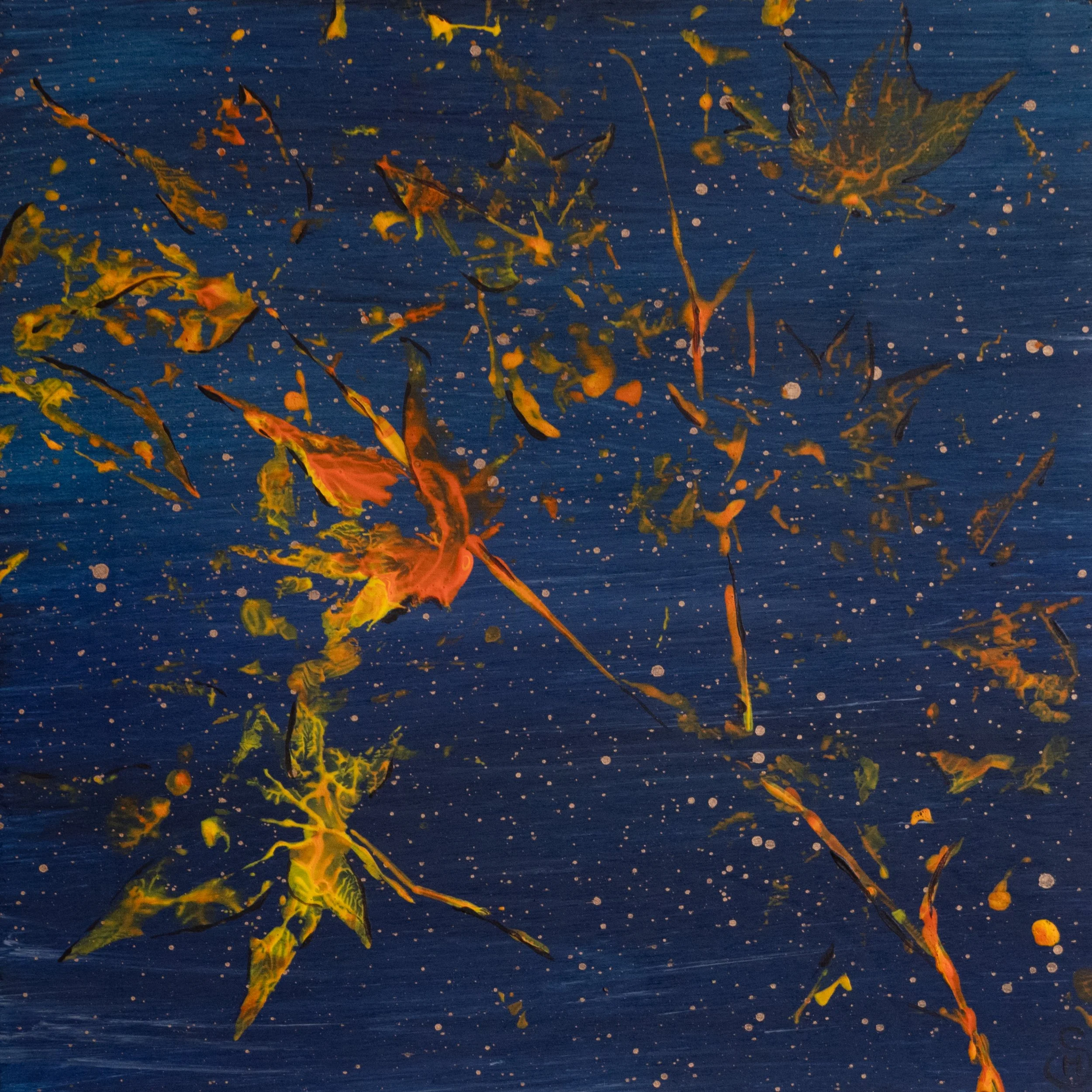 A cool morning in fall, the tentative sun backlighting the wafting grey clouds as the stars quietly fade. Against the gentle dawn skies, a riot of bright leaves, celebrating the change of the season in yellow, orange and red.